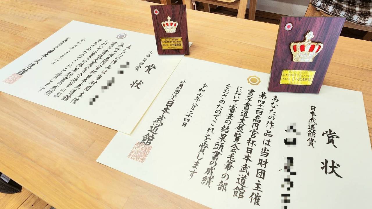 今年出品した高円宮杯日本武道館書写書道大展覧会で、中学3年生の生徒が毛筆で「日本武道館賞」を受賞しました!
